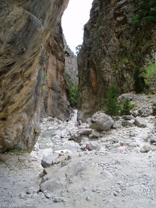 Mit 3 bis 4 Metern in der Breite ist die Eiserne Pforte, eines der sogenannten Felsentore, die engste Stelle der Samaria-Schlucht. An den breitesten Stellen ist sie bis zu 150 Meter breit.