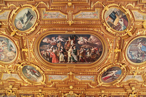 Zwanzig neun Meter hohe mit stuckverzierten Marmorsäulen gipfeln hier in eine knapp 14 Meter hohe ovale Kuppel mit drei Deckenfresken, womit der Kaisersaal einen überwältigenden repräsentativen Zweck erfüllte.